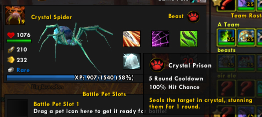 They’re also a fairly decent pet battler across the level gamut, which tends to be rare. They get the Leech Life ability at level 5 to heal themselves, and as a result they’re a hardy choice for grinding. Unlike the Frogs, spiders can have varied movesets. For example, the crystal spider has a stun instead of the DoT poison ability.