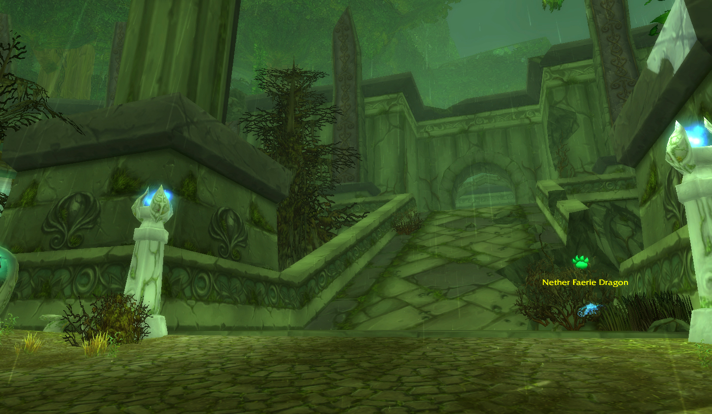Nether Faerie Dragons are Dragonkin battle pets which like to hang out around Dire Maul in Feralas. They can be tamed in the open air area in the world, and are not present in the Dire Maul instance. They share a moveset with the very colorful Sprite Darters, also found in Feralas, but the Sprite Darters are drops. The two share a very similar skin as well, but Nether Faerie Dragons are transparent, which can make them just a bit difficult to screenshot, thank you very much.