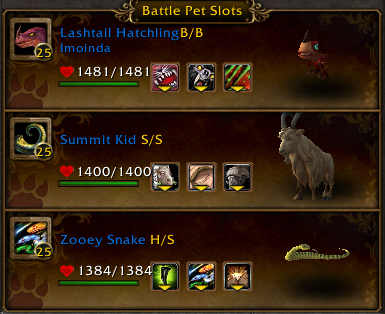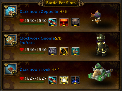 The first 2 battle pets selected, the Darkmoon Tonk and Darkmoon Zeppelin, have a straightforward single-hit damage dealer, plus a huge hitting single nuke blaze of glory move. The anchor battle pet, the Sunreaver Micro-Sentry, has a few relatively straightforward moves, but more importantly the Extra Plating move, which gives that last pet far more longevity to hopefully finish off Gorespine.