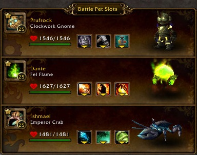 My clockwork gnome Prufrock was one of the very first pets I chose to level, and I chose well. He is still one of the first pets I choose for world battles. Being mechanical, he’s very strong against beasts. I use him when I need to take down three of the harder battles in the game right now: Major Payne, Aki, and Jeremy Feasel are all mowed down summarily by his turret.