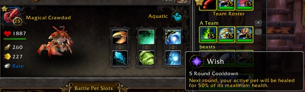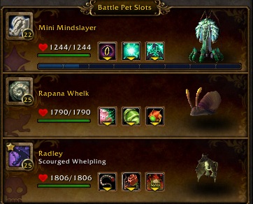 The Anubisath Idol is fairly indispensable here because of his Sandstorm/Deflection combo. To carry a level 1 Sandstorm is really key, but if you’re going for level 10 or higher carries, or just beating the encounter the first time around, most pets with a decent heal will work pretty well in the first slot. My trusty crab Ishmael is of course a good pick, but I’ve also used frogs and my Perky Pug Bertha for this too. The carry pet is in the middle slot, and the anchor is a Flying battle pet, preferably with some kind of avoidance move. Moths with Cocoon and fliers with Lift-Off work really well, but another option is to go glass cannon, with something like a Gilnean Raven.