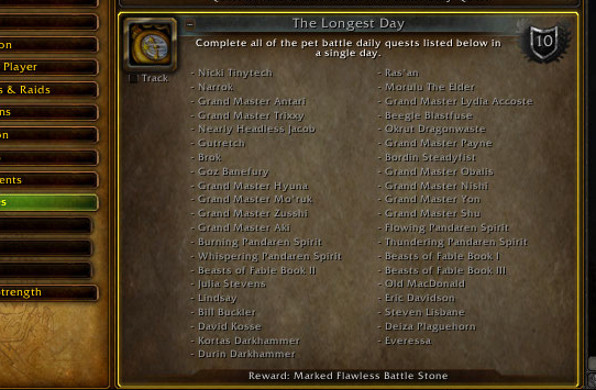 In 5.3 they start very helpfully marking the tamers on the map now. The paw prints persist even after you complete that particular quest or daily for the day, so you still need your ‘did I do that one yet?’ addon. They also added a new achievement, “The Longest Day” for fighting all the tamers involved in dailies in a single day. All.