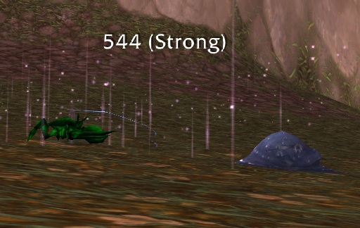 Sludgy’s damage is very streaky, due both to his moderate miss ability Expunge, and the way he uses (or doesn’t use) his other two abilities. One is the hard-hitting magic Ooze Touch, and the other is a fairly cruddy DoT spell, Creeping Ooze. It’s relatively random which one he uses, whether it hits or not, etc. Some fights I can plow straight through the whole way with Bertha, and others I get two shot. Hence the above pic illustrating Bertha hitting him hard with her beast damage where there’s a crab in place of poor little dead Bertha.