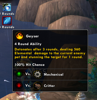 I’ve been seeing the geyser/whirlpool combo in PVP a few times recently. The only pet with this combo is the mini Flowing Pandaren Spirit, so if you see that coming, you know what you’re in for, but you can try using whirlpool or geyser with Dive for another decent combo.